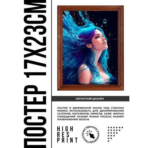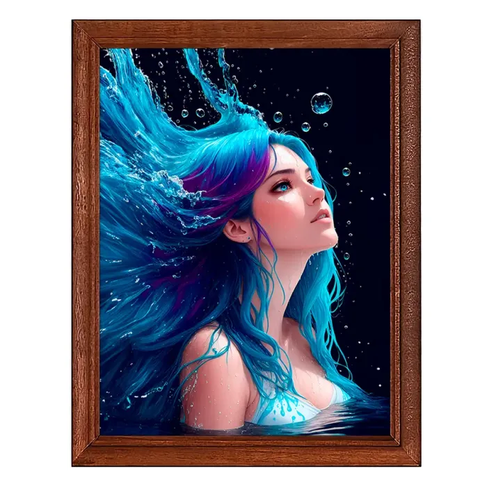 Постер в рамке для интерьерного декора. Деревянная рама с пластиковым стеклом, изображение девушки в воде.