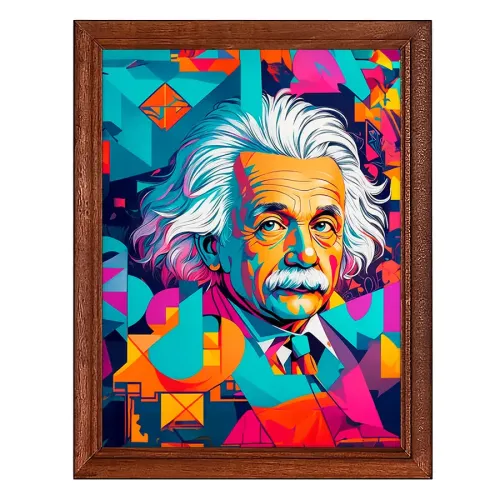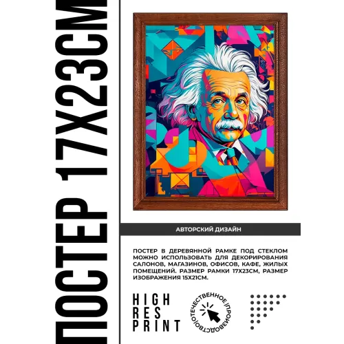 Постер в рамке с изображением Эйнштейна для интерьерного декора. Деревянная рамка с пластиковым стеклом и ножкой для размещения на поверхности.