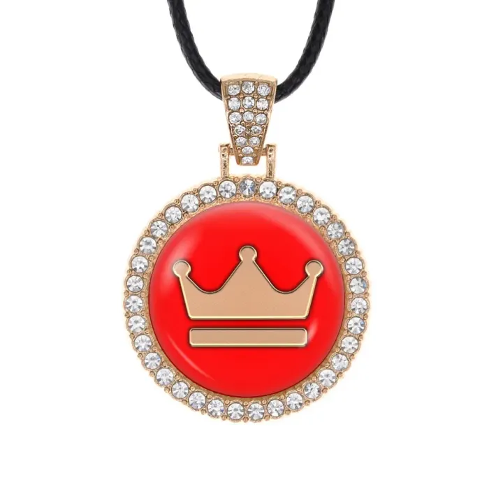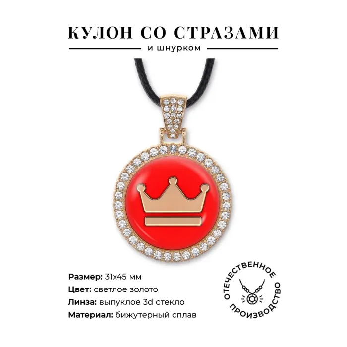 Кулон в виде короны из бижутерного сплава со стразами и стеклянной линзой.