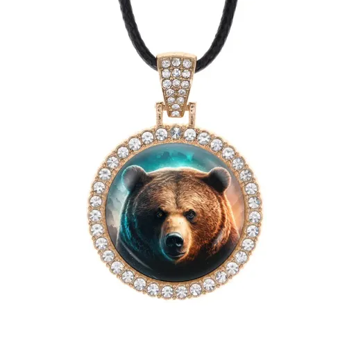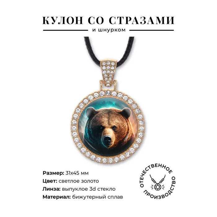 Кулон-амулет в форме медведя из бижутерного сплава с покрытием под светлое золото, инкрустированный стразами.