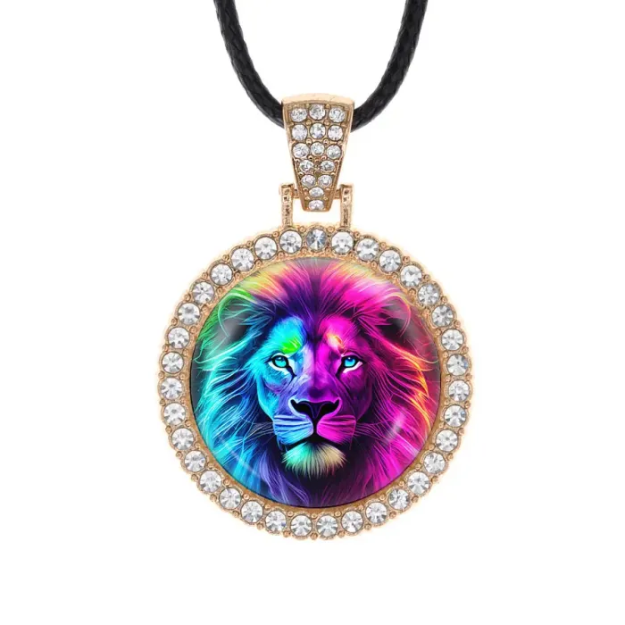 Кулон-амулет из бижутерного сплава с покрытием под светлое золото, инкрустированный стразами. Изображение защищено выпуклой стеклянной линзой.