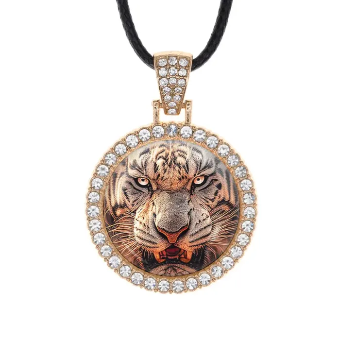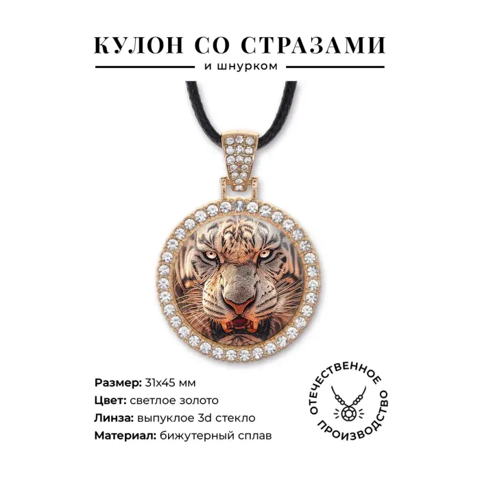 Кулон-амулет из бижутерного сплава с покрытием под светлое золото, инкрустированный стразами. Изображение защищено выпуклой стеклянной линзой.