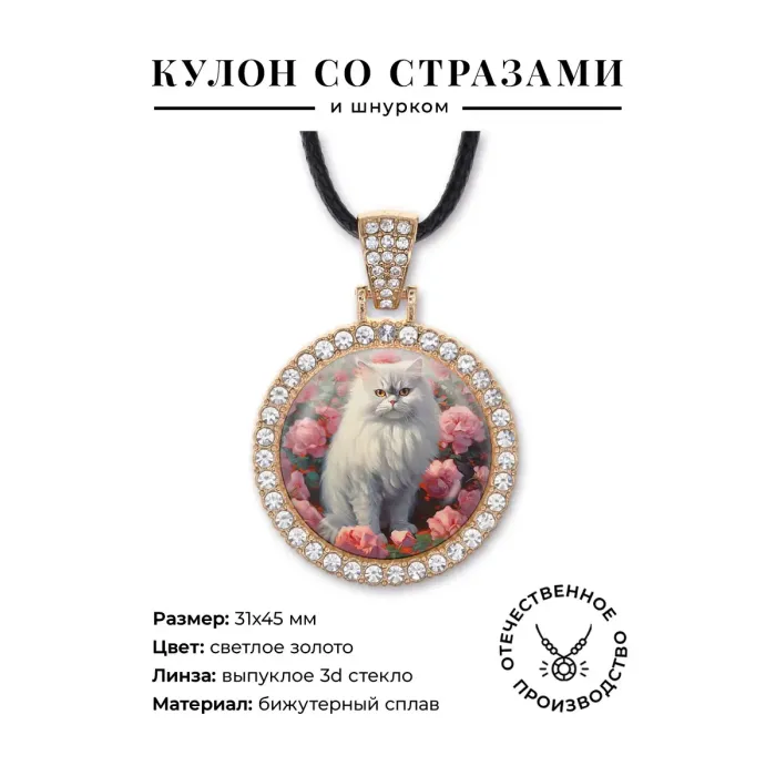 Кулон со стразами «Кот и цветы» — это изысканный амулет, который сочетает в себе красоту и символику. Изготовленный из бижутерного сплава с покрытием под светлое золото, он инкрустирован качественными австрийскими стразами, что придаёт изделию особый блеск. Защита изображения осуществляется благодаря выпуклой стеклянной линзе, что делает кулон не только стильным аксессуаром, но и долговечным украшением. В комплект входит шнурок с застёжкой для удобства ношения. Упаковка выполнена в виде прозрачного полипропиленового пакетика без подвеса — идеальный вариант для подарка или хранения.