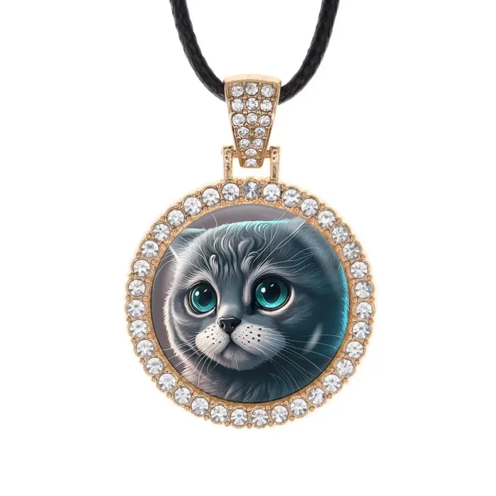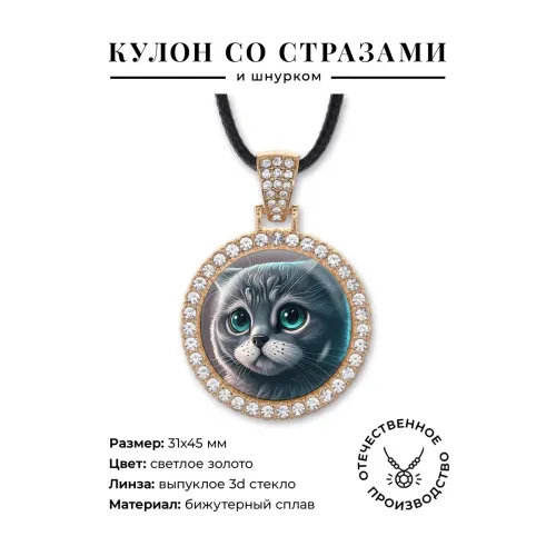 Кулон-амулет с изображением котёнка из бижутерного сплава в покрытии светлое золото, инкрустированный стразами.