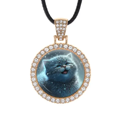 Кулон из бижутерного сплава со стразами и выпуклой стеклянной линзой.