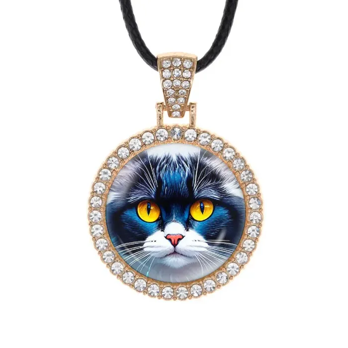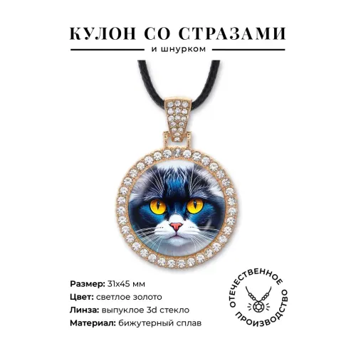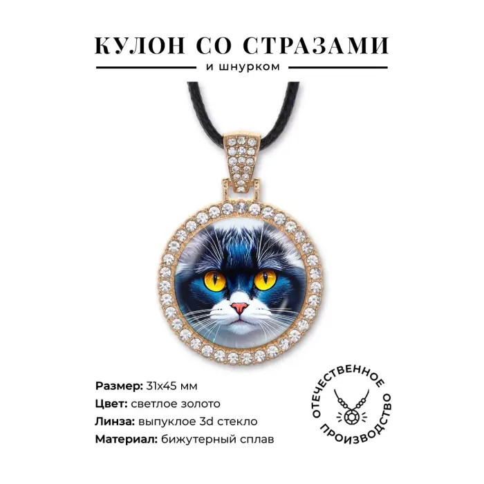 Кулон-амулет в форме кота из бижутерного сплава с инкрустацией стразами и выпуклой стеклянной линзой.