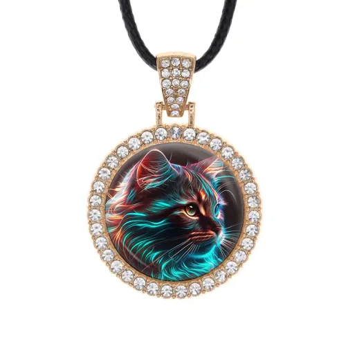 Кулон из бижутерного сплава в форме кота с инкрустацией стразами и стеклянной линзой.