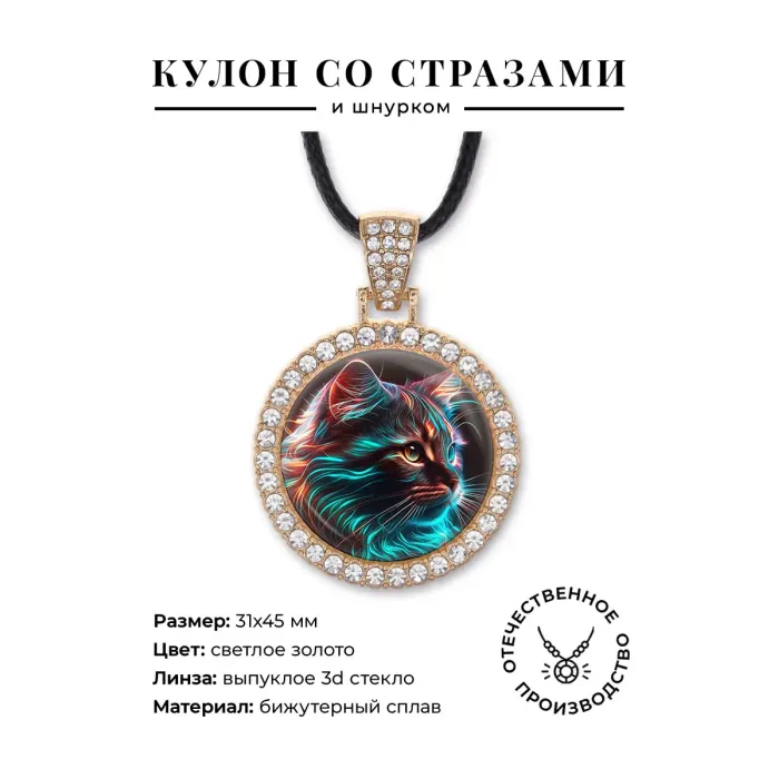 Кулон со стразами Неоновый кот, цвет светлое золото ALKS0128