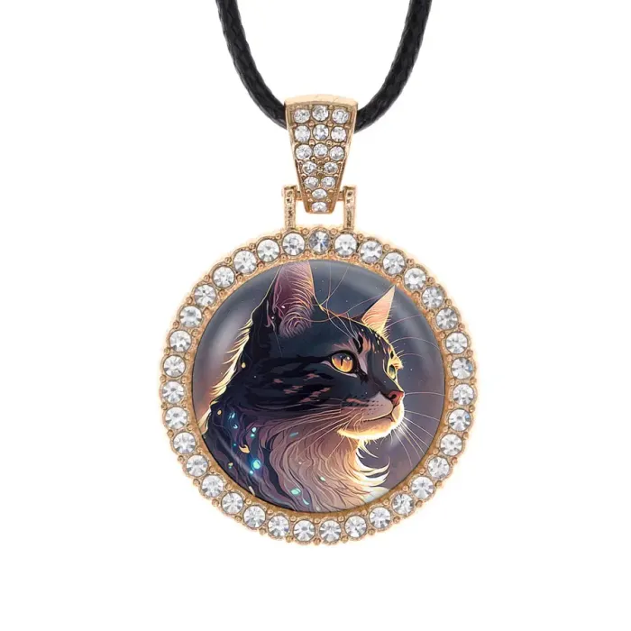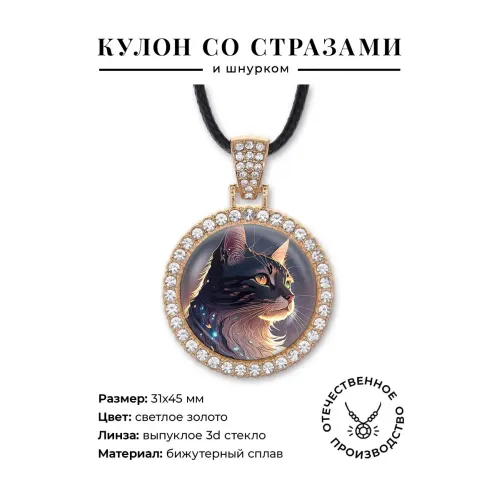 Кулон-амулет в виде кошки из бижутерного сплава с покрытием под светлое золото, инкрустированный стразами.
