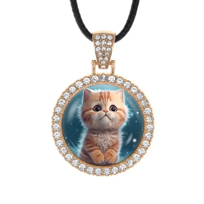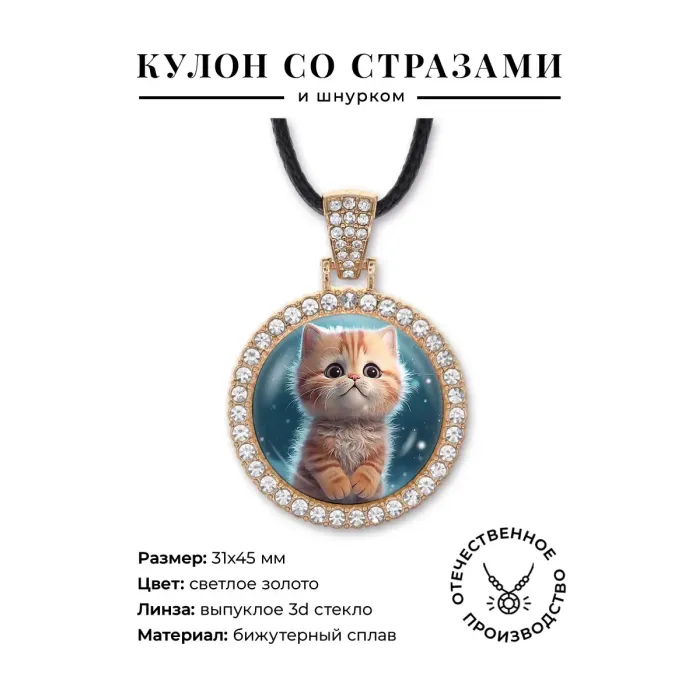 Сувенирный кулон в форме котёнка из бижутерного сплава со стразами и стеклянной линзой.
