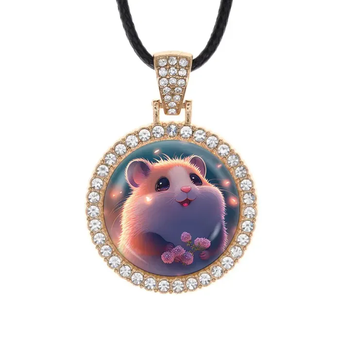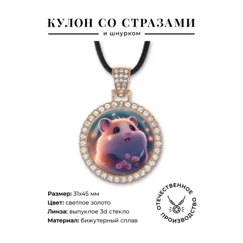 Кулон-амулет в виде хомячка из бижутерного сплава со стразами и выпуклой стеклянной линзой.