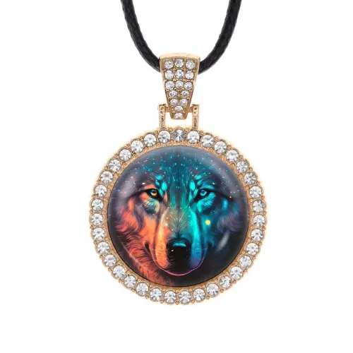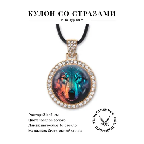 Кулон со стразами в виде волка. Изготовлен из бижутерного сплава с покрытием под светлое золото, инкрустирован стразами. Изображение защищено выпуклой стеклянной линзой.