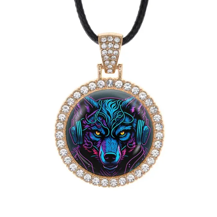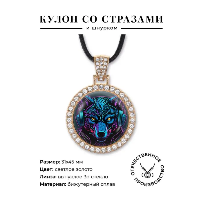 Кулон «Волк в наушниках» из бижутерного сплава с инкрустацией стразами и выпуклой защитной линзой.