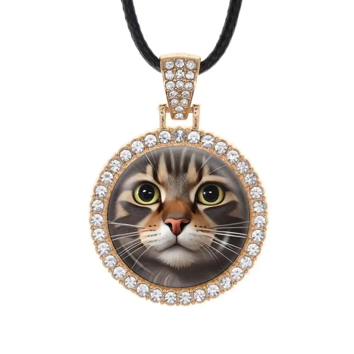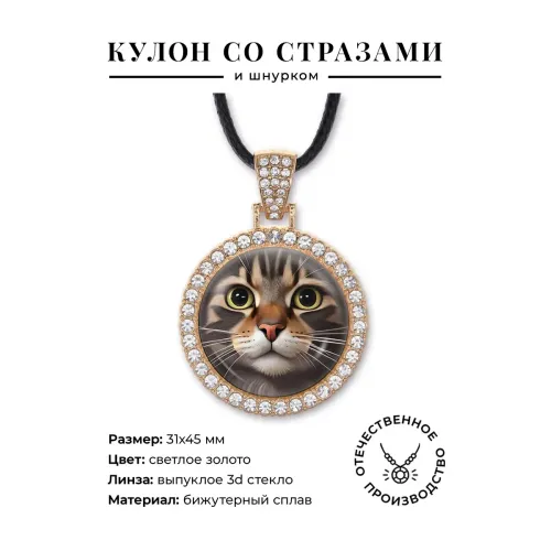Кулон-амулет в форме кошки из бижутерного сплава с инкрустацией стразами и выпуклой стеклянной линзой.