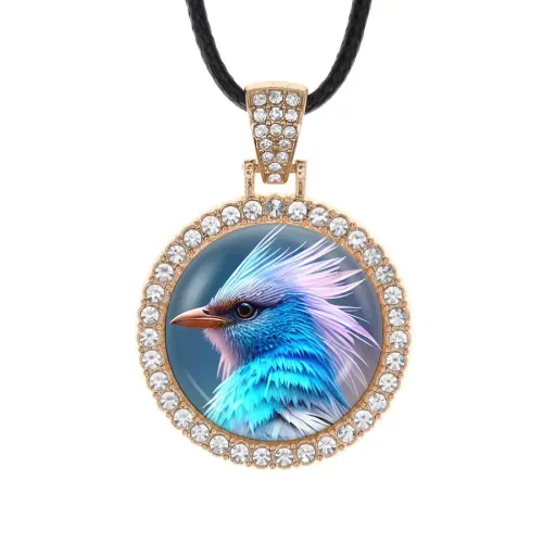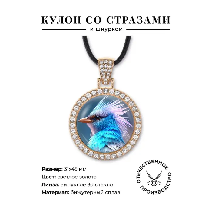 Кулон из бижутерного сплава в форме птицы, инкрустированный стразами, с выпуклой защитной линзой.