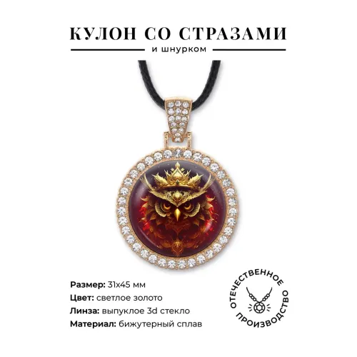 Кулон из бижутерного сплава в цвете светлое золото с инкрустацией стразами и выпуклой стеклянной линзой.