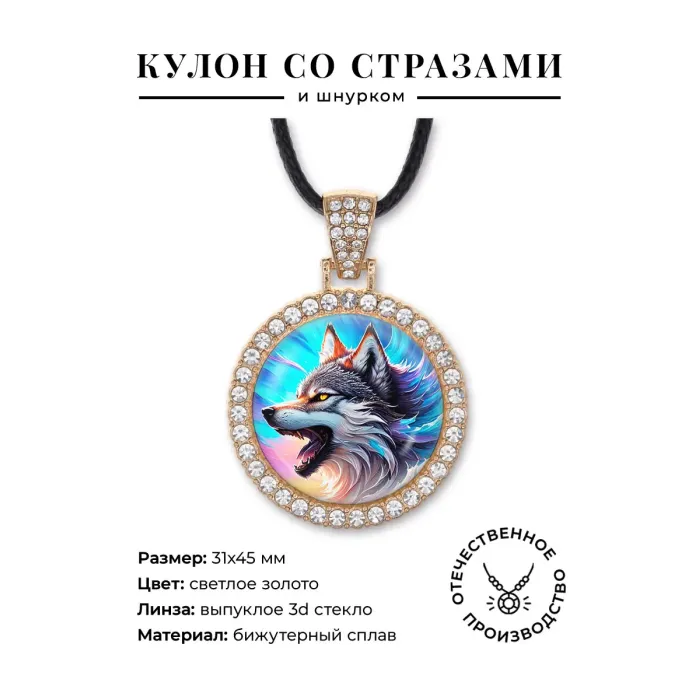 Кулон-амулет из бижутерного сплава с покрытием под светлое золото, инкрустированный стразами и защищённый выпуклой стеклянной линзой.
