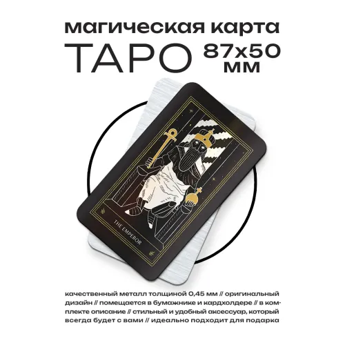 Магическая карта таро Император — это не просто сувенир, а символ силы и лидерства. Она наделяет качествами уверенности и решительности, способствует росту авторитета и удовлетворению амбиций. Изготовленная из металла толщиной 0,45 мм, эта карта имеет размеры 50х87 мм и упакована в прозрачный пакетик с описанием. В традиционном контексте карты Таро играют важную роль в самопознании и поиске ответов на жизненные вопросы.
