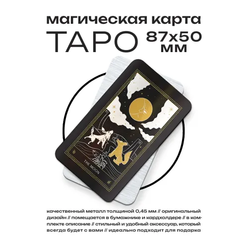 Магическая карта таро Луна — это уникальный сувенир, который традиционно используется для предостережения от опасностей и помогает справиться со страхами. Эта карта способствует раскрытию обмана и избавлению от негативных эмоций, что делает её ценным помощником в личной практике. Изготовленная из металла толщиной 0,45 мм, она отличается прочностью и долговечностью. Размер карты составляет 50х87 мм, а упаковка в прозрачный пакетик с описанием добавляет удобства при хранении или подарке. Карта Таро Луна является не только инструментом для гадания, но и символом интуиции и мистики.