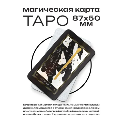 Магическая карта таро Туз жезлов — символ находчивости и мужества, вдохновляющий на смелые решения и готовность к переменам. Эта карта помогает раскрыть творческий потенциал и наполняет оптимизмом, позволяя определить жизненные цели. Изготовлена из металла толщиной 0,45 мм с размерами 50х87 мм. Упакована в прозрачный пакетик с описанием, что делает её отличным подарком или элементом коллекции для ценителей мистики и эзотерики.