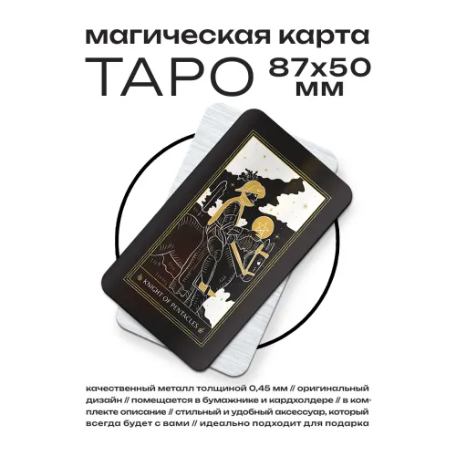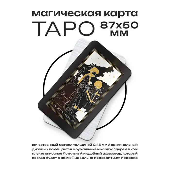 Магическая карта таро Рыцарь пентаклей символизирует энергию и напор, помогая сосредоточиться на достижении конкретных целей. Эта карта традиционно используется для поддержки в период активной реализации замыслов и планов, вдохновляя на прагматичные действия. Изготовленная из металла толщиной 0,45 мм, она имеет размеры 50х87 мм и поставляется в прозрачном пакетике с описанием. Карта станет отличным дополнением к коллекции или подарком для тех, кто интересуется эзотерикой.