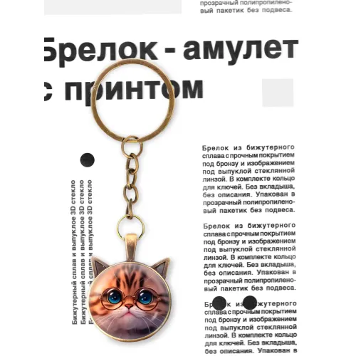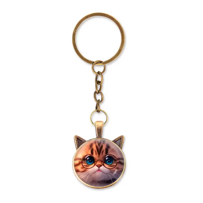 Брелок из бижутерного сплава с изображением котёнка в очках под выпуклой стеклянной линзой.