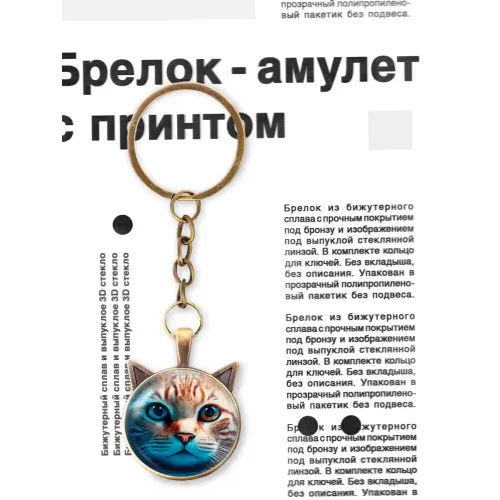 Брелок для ключей из бижутерного сплава с изображением космического кота под выпуклой стеклянной линзой.