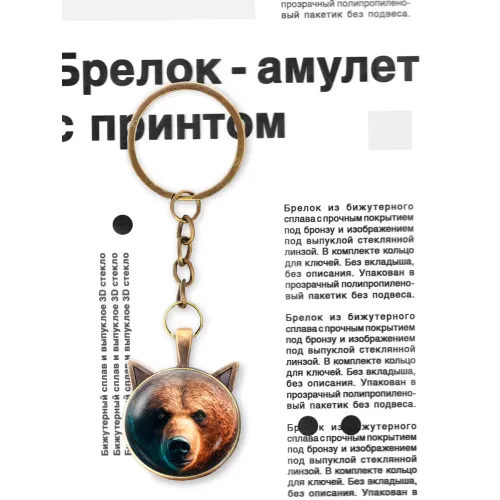 Брелок для ключей из бижутерного сплава с покрытием под бронзу. Изображение медведя защищено выпуклой стеклянной линзой.