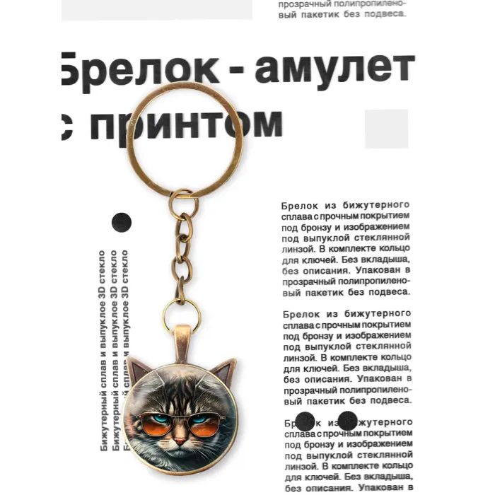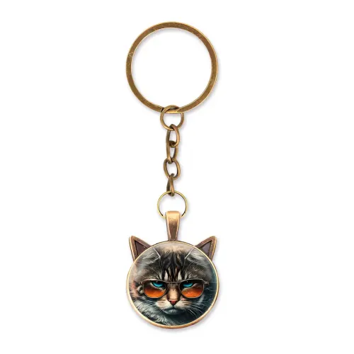 Брелок из бижутерного сплава с изображением кота в очках под выпуклой стеклянной линзой.