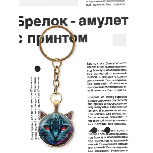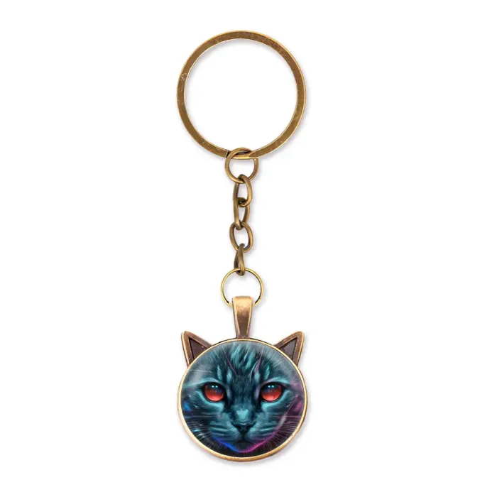 Брелок для ключей из бижутерного сплава с изображением кошки под выпуклой стеклянной линзой.