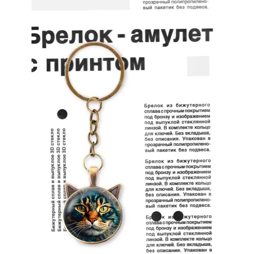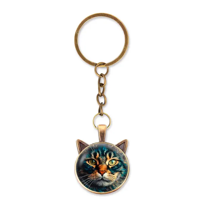 Брелок с портретом кота из бижутерного сплава с покрытием под бронзу и выпуклой стеклянной линзой.