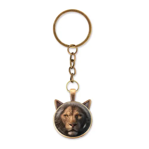 Брелок для ключей из бижутерного сплава с покрытием под бронзу и выпуклой стеклянной линзой.