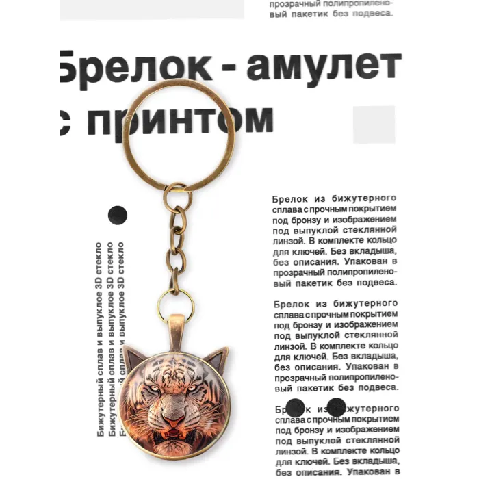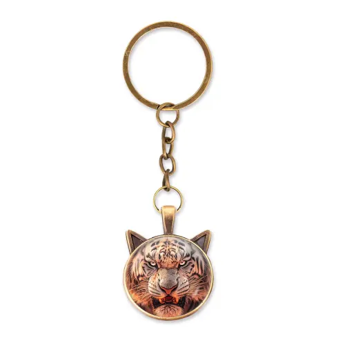 Брелок для ключей из бижутерного сплава с изображением белого тигра под выпуклой стеклянной линзой.