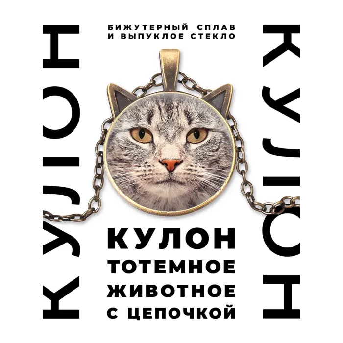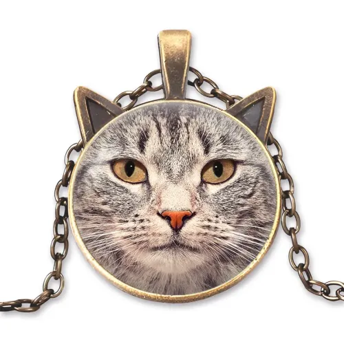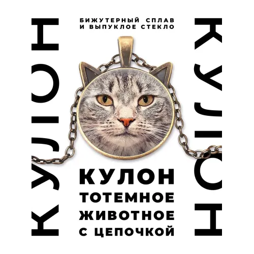 Кулон с изображением кота, выполненный из бижутерного сплава с покрытием под бронзу. Изображение защищено выпуклой стеклянной линзой.