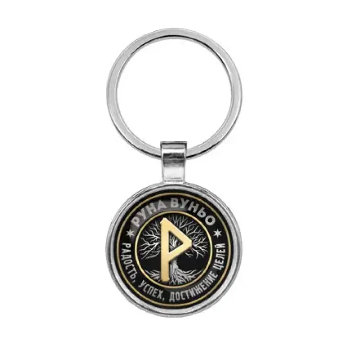 Брелок с изображением руны Вуньо. Изготовлен из бижутерного сплава, стали и стекла.