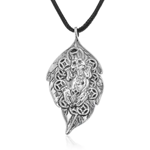 Сувенирный амулет в виде листа с монетами и Пи Щу на шнурке, выполненный из металла.