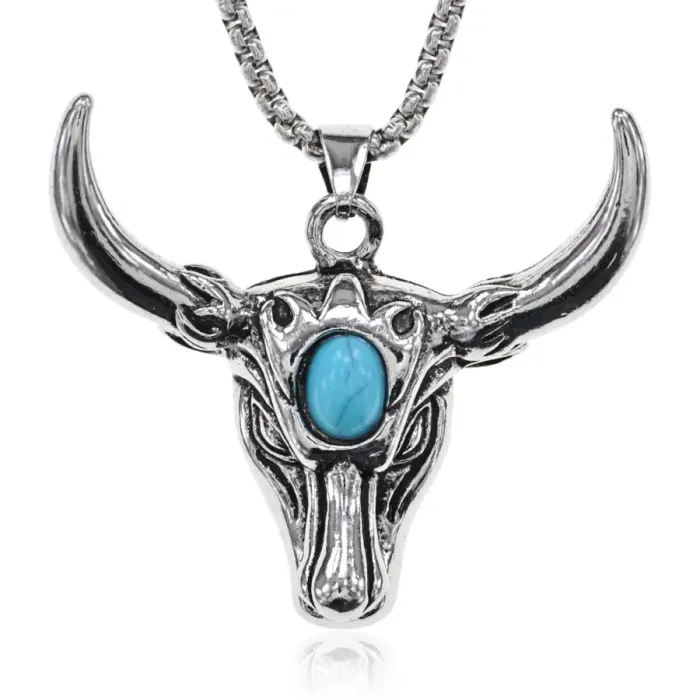 Металлический амулет в виде быка с вставкой из синтетической бирюзы и серебристым покрытием.