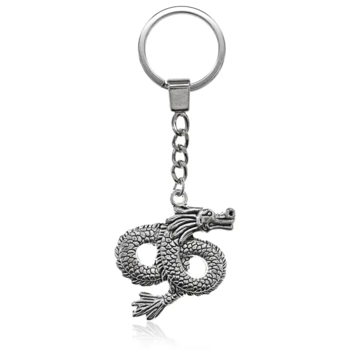 Брелок из металла с покрытием под серебро в виде фигурки дракона.