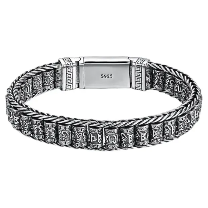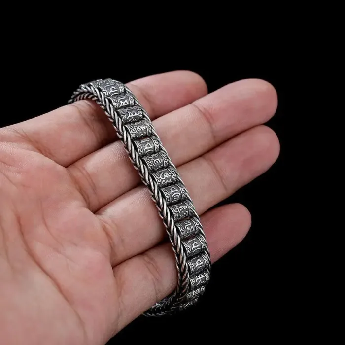 Браслет из металла с покрытием под серебро в виде цепи с элементами в виде мантр.