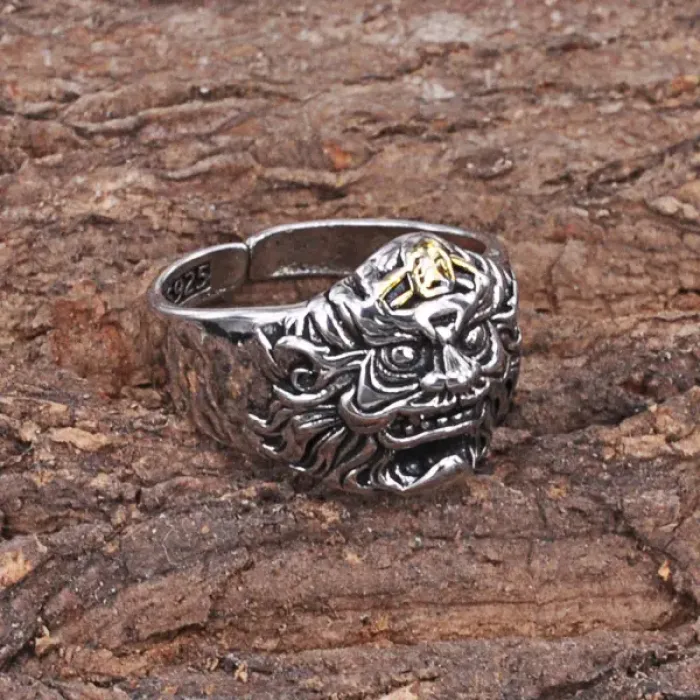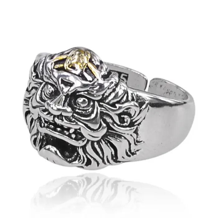 Безразмерное кольцо с изображением льва Шиши. Металлический аксессуар шириной 13 мм.