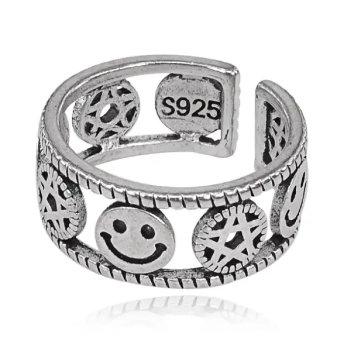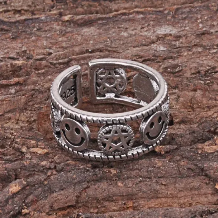 Безразмерное кольцо с дизайном в виде звезды и смайлика. Изготовлено из металла с покрытием под серебро.