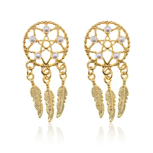 Серьги «Ловец снов» — бижутерный аксессуар с искусственным жемчугом и покрытием под золото.