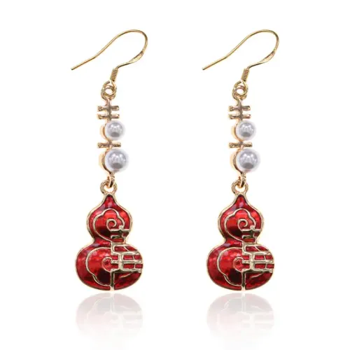 Серьги в виде тыквы-горлянки из бижутерного сплава с эмалевым декором и искусственным жемчугом.