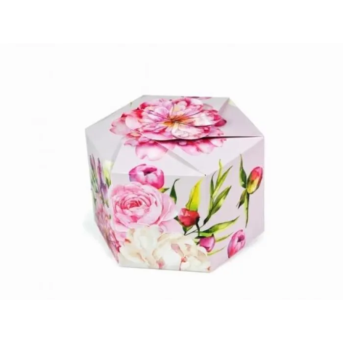 Подарочная упаковка «Пионы» в форме шестигранника предназначена для создания стильных подарков. Основные особенности включают декоративный замок в виде цветка пиона и нежные оттенки.