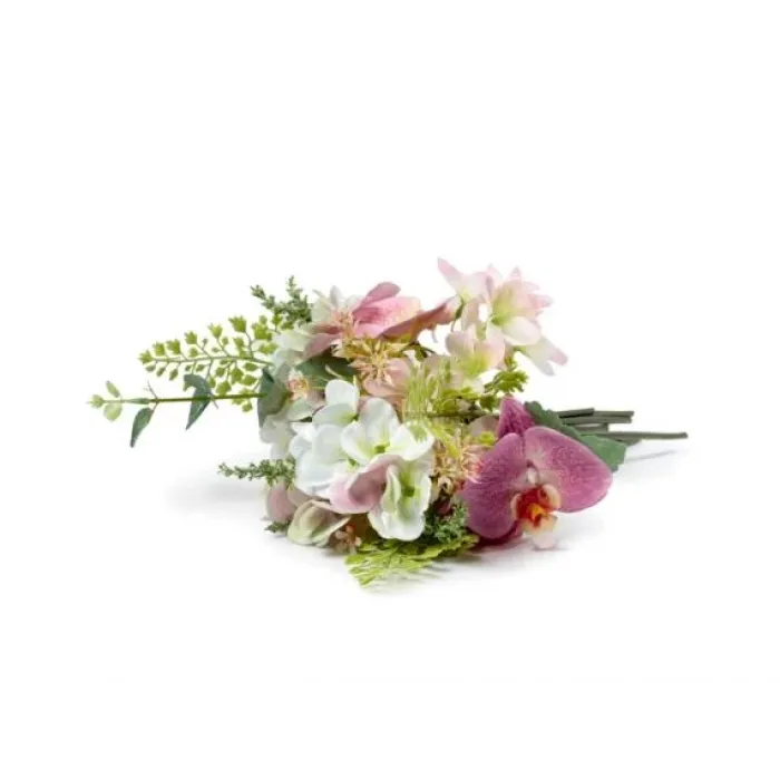 Декоративный букет из искусственных орхидей и гортензий предназначен для украшения интерьера. Композиция в бело-розовых оттенках имеет универсальный дизайн, подходящий для создания стильного акцента.