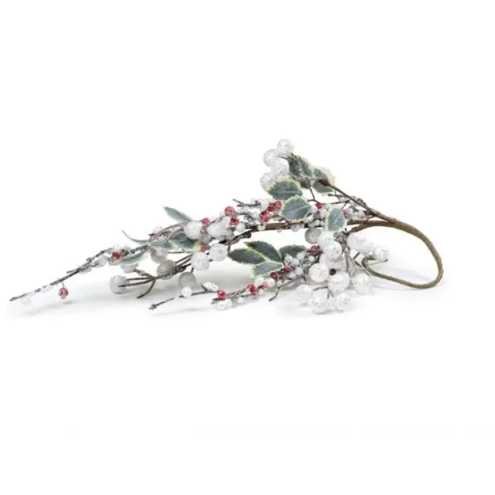 Изготовлена из пластика и металла. Гибкое проволочное основание позволяет легко закрепить ветвь в нужном месте. Ягоды и листья покрыты серебристыми блёстками.