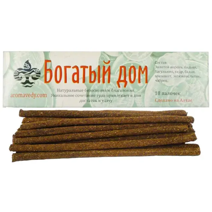 Благовония натуральные «Богатый Дом» наполняют пространство гармонией и позитивной энергией. Состав из уникального сочетания золотого корня, бадьяна, багульника, кедра, бадана, эвкалипта, можжевельника и чабреца создает атмосферу достатка и удачи.