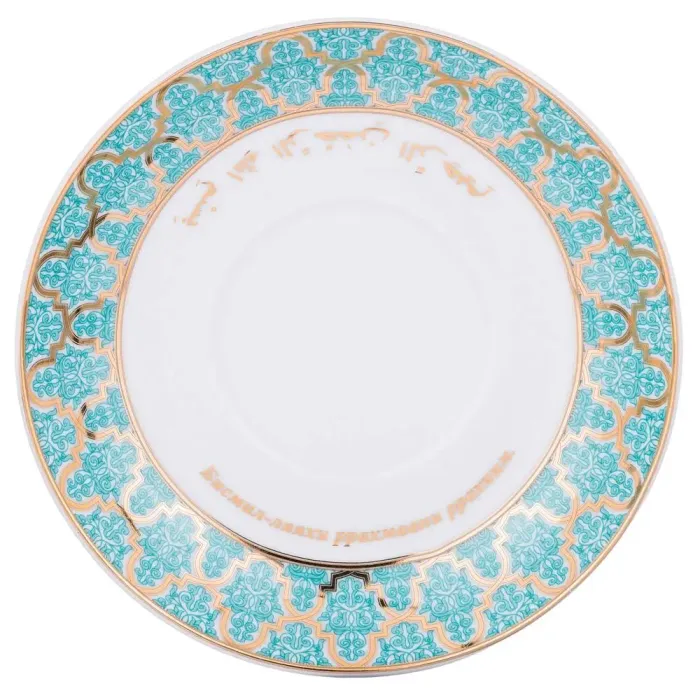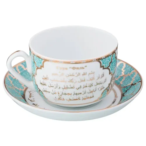 Пара изготовлена из тонкостенного фарфора, что обеспечивает лёгкость изделия. Поверхность украшена восточным орнаментом и фрагментами сур из Корана на арабском и русском языках с применением золочения. Конструкция состоит из чашки и блюдца, предназначенных для совместного использования.