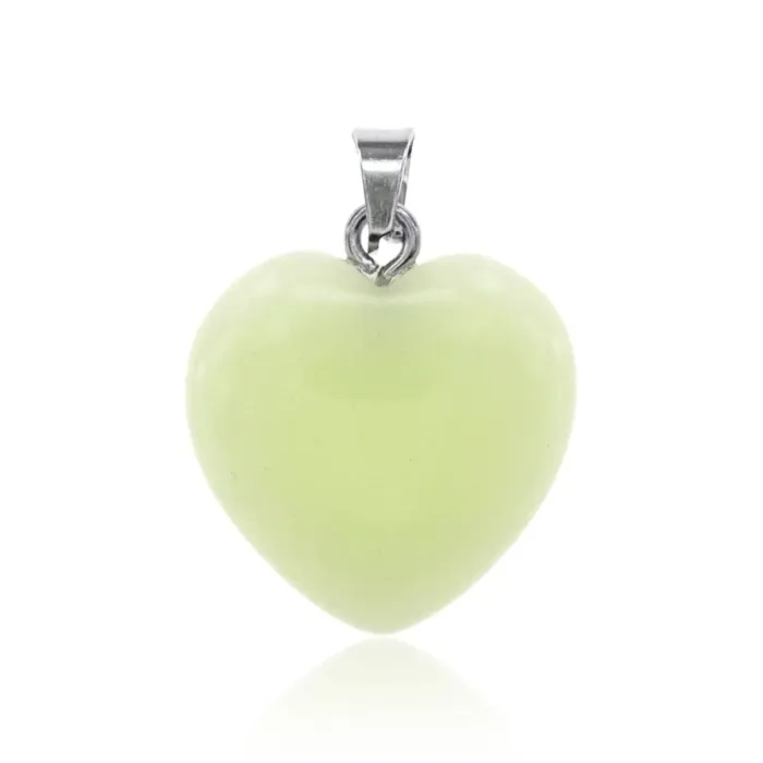 Кулон в форме сердца из светящегося нефрита зеленого цвета с металлической фурнитурой.