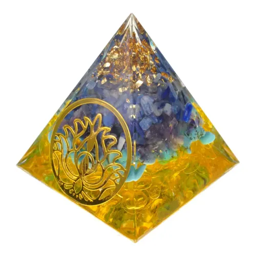 Сувенирная фигурка в виде пирамиды с изображением лотоса, изготовленная из эпоксидной смолы.